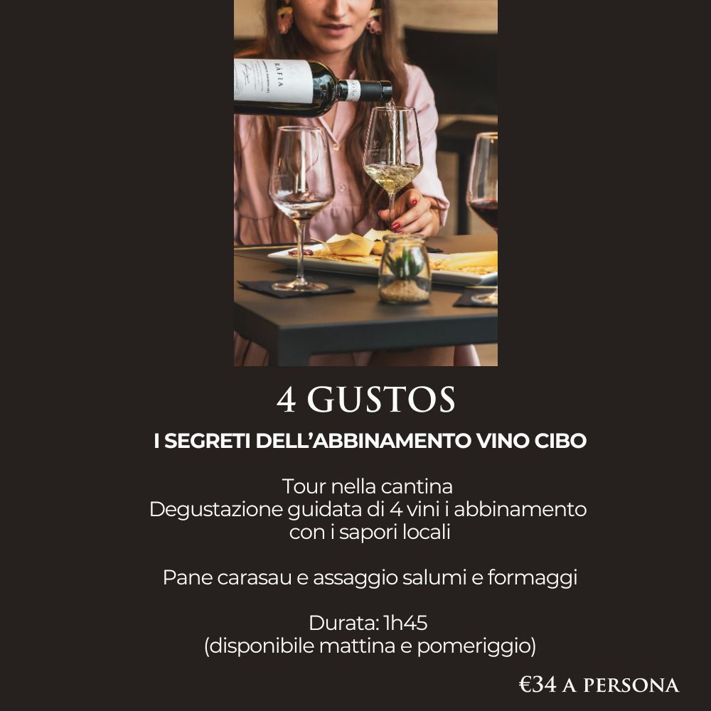 LA DEGUSTAZIONE 4 GUSTOS è un viaggio guidato nel cuore della cantina, pensato per chi desidera scoprire il vino attraverso L'ABBINAMENTO CIBO VINO , attraverso un esperienza DI DEGUSTAZIONE di 4 vini abbinati a prodotti dai sapori locali Visita guidata alla Cantina, degustazione di quattro delle nostre importanti etichette .